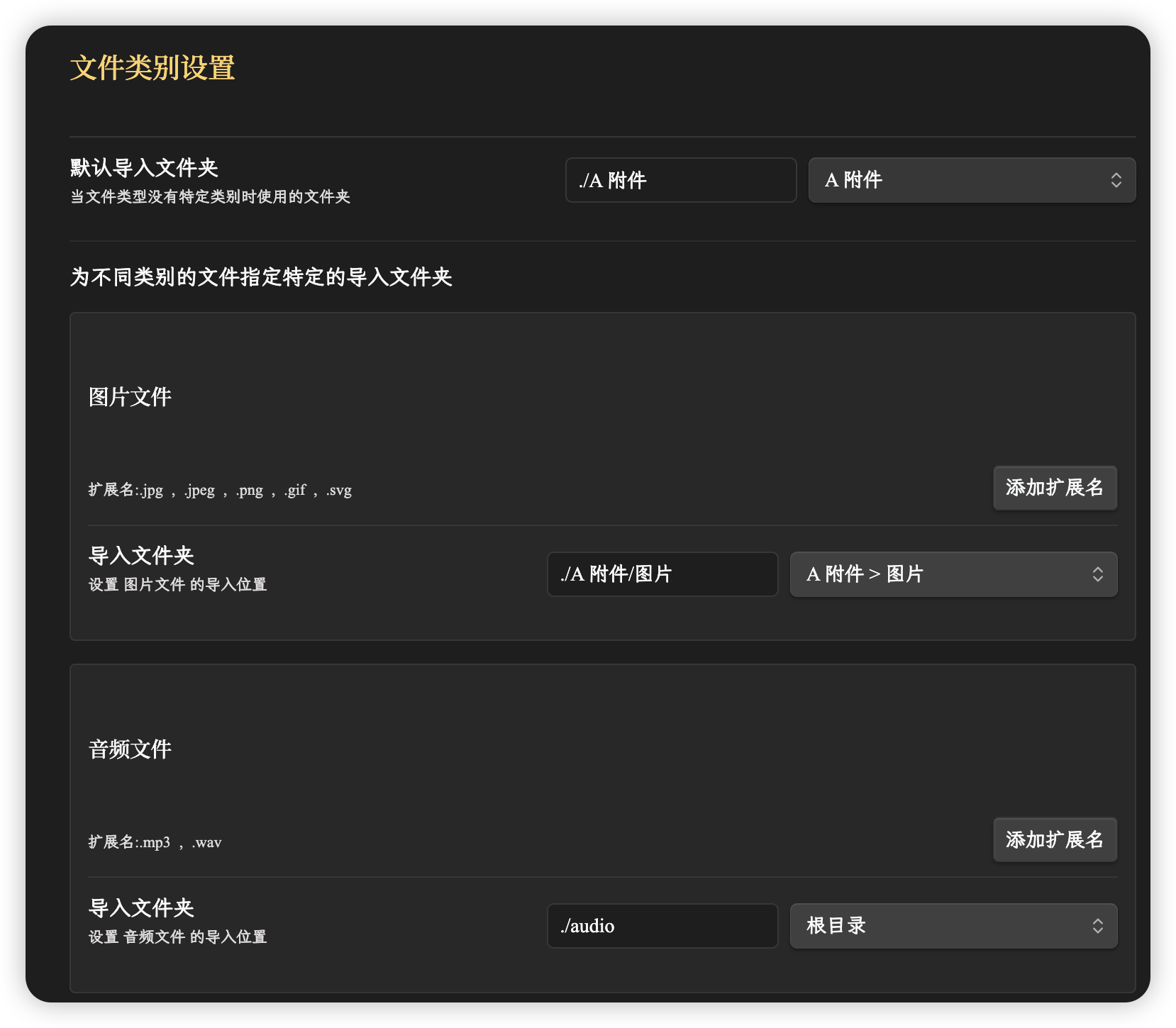是这样,默认得附件管理只能指定附件的位置不能指定附件类型,我现在需要一个可以把不同类型得附件指向不同目录得插件,比如pdf格式文件指向福建目录下的"文档"目录,png这种就指向"图片",试了几个插件都不大行,有没有推荐的呀