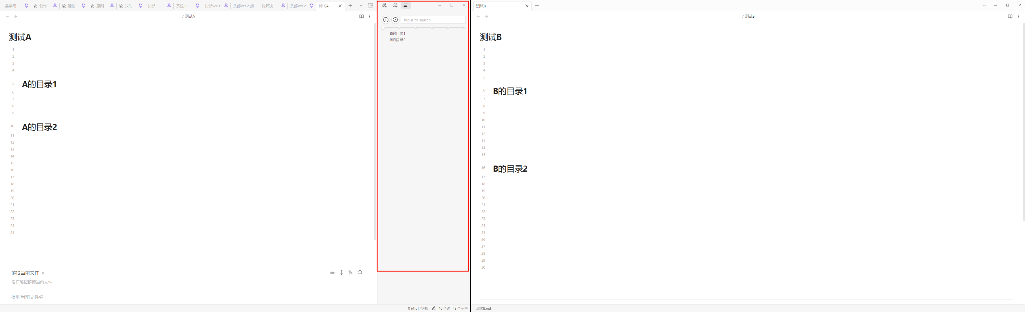 如下图,我有左右两个显示器,我在两个显示器里分别打开了一个obisidian文件。但只有一个文件的界面显示了目录栏(右侧,红框所示),另一个却空空如也啥功能界面都没有,这就导致了我在另一个界面里操作时 总是 得时不时回到另一个屏幕上去操作。