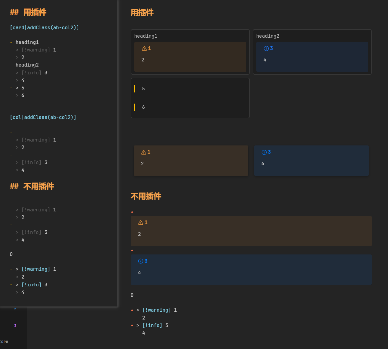 如图左边是我的源码右边是阅读效果,上面是2col语法下面是普通callout.