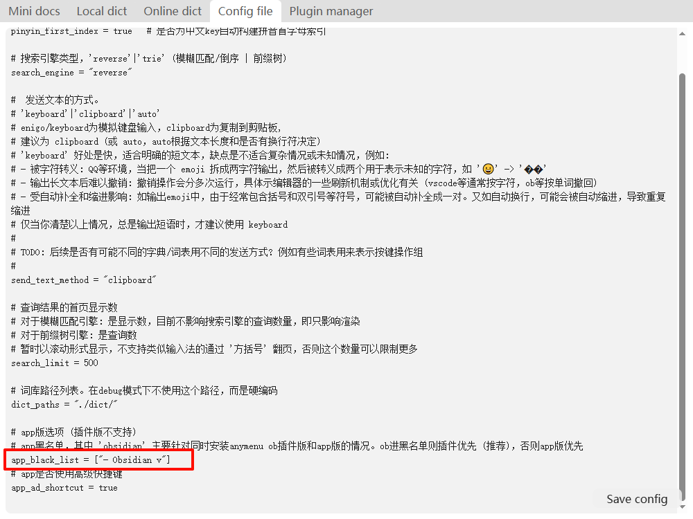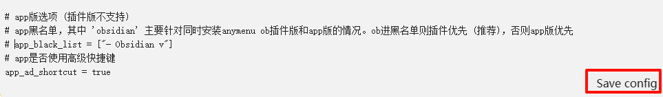 删掉全行/前面加# → Save config → Restart/停止运行软件再打开 → 打开设置,上面截图位置里的 app_black_list = [“- Obsidian v”] 还是存在