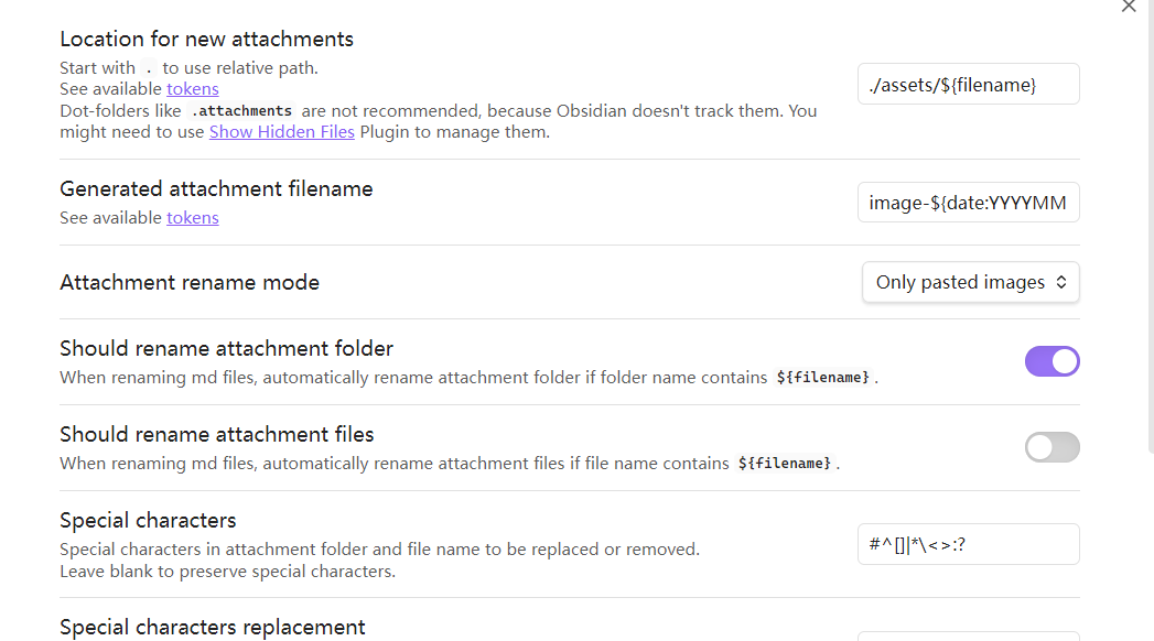 我的命名方式是{{fileName}}-{{number}},再打开自动重命名。也就是说如果我的文件名叫Graphics,那么粘贴进去的图片会被自动命名为Graphics.png, Graphics-1.png, Graphics-2.png.