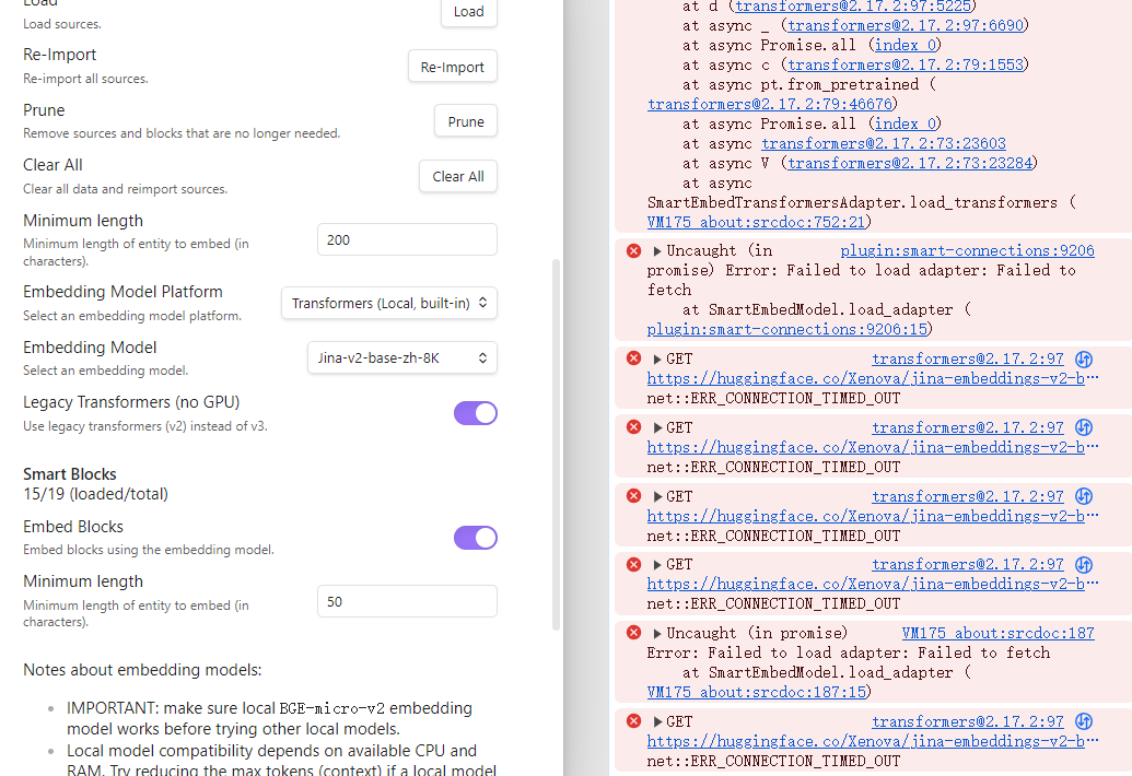 解释: 它首次运行嵌入时, 依赖两个网上的资源: transformers.js 是从 jsdelivr 下载, 嵌入模型 Jina-v2-base-zh-8k 是从 huggingface 下载