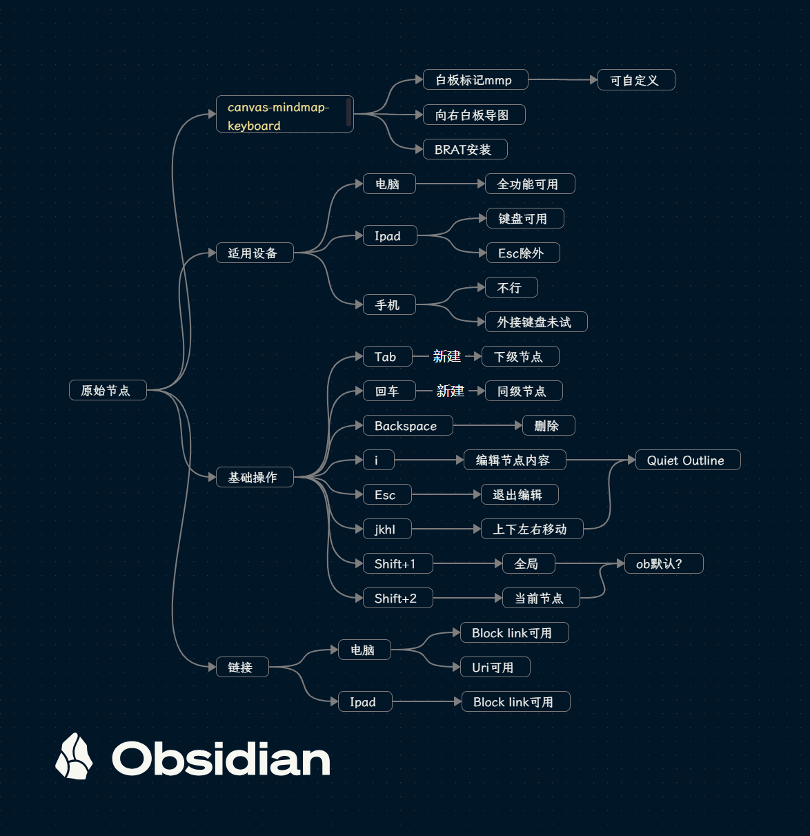 安装Canvas Mindmap插件,设置tab新增子节点,Enter新增兄弟节点,空格编辑节点。