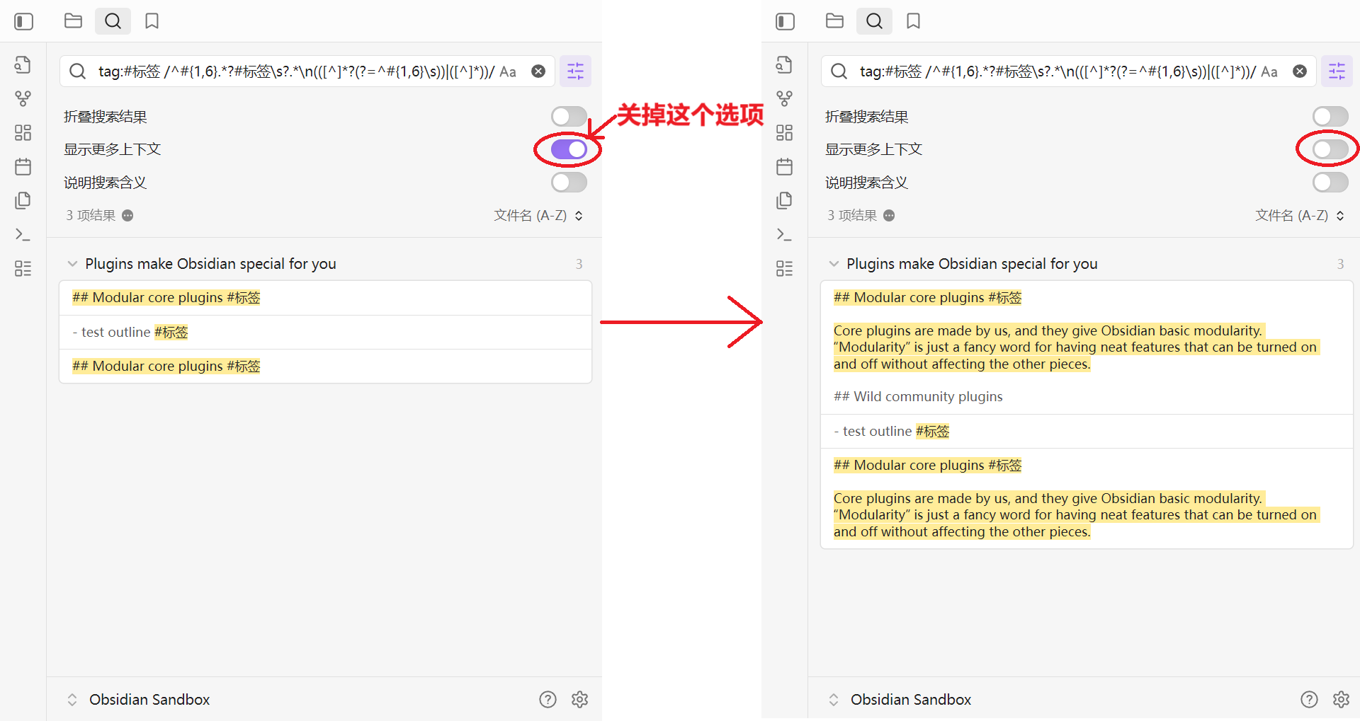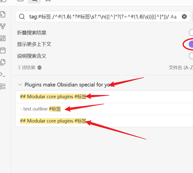 要注意关闭 折叠搜索结果 选项和 显示更多上下文 选项,否则匹配到的标题有关键词的章节的内容不会显示在查询结果列表里