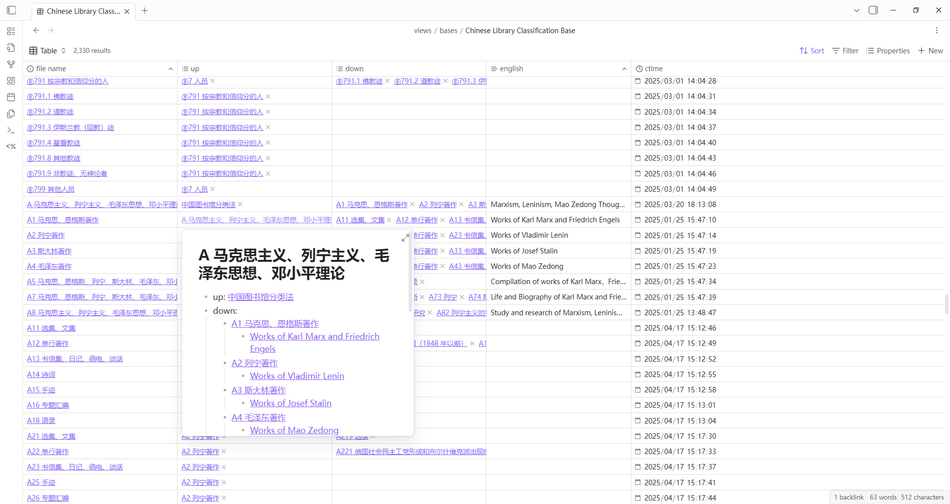 我的方法也是在此之上进行了修改,即对于概念型知识点,我们可以在yaml中链接其父概念从而构建概念层级,可以根据概念特征设置属性类型(比如《xx手机》可以设置处理器型号、品牌、上市时期、操作系统等属性类型,从而链接相应笔记)。这样就构建了知识网络。