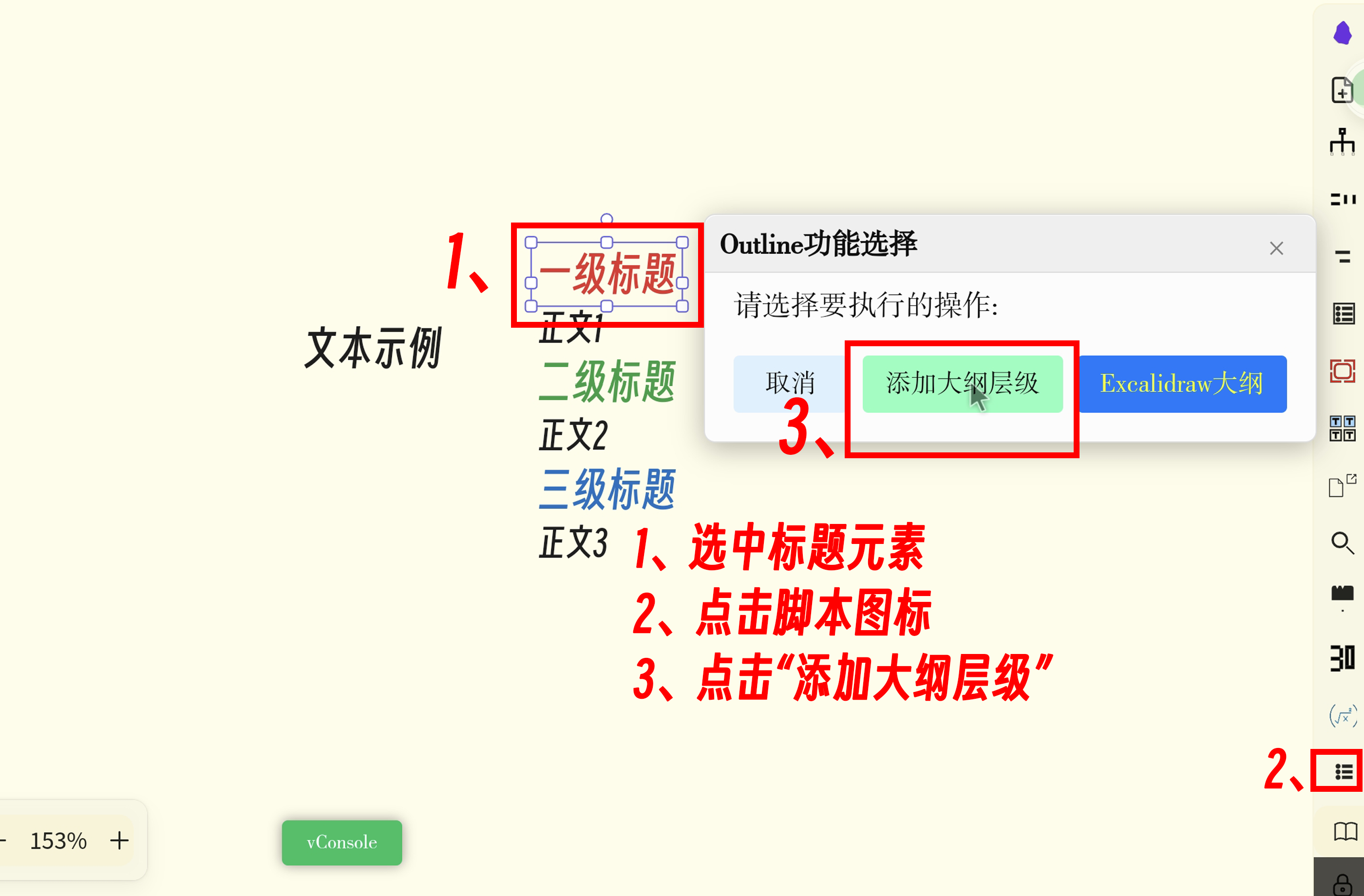 但是Excalidraw的大纲功能几乎等于没有,于是自己写了一个脚本实现大纲功能。