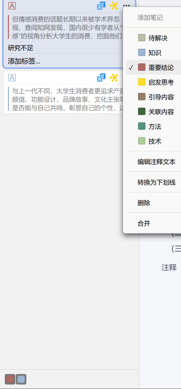 - 怎样编辑侧边栏显示的标注卡片模板,使得能够在卡片上显示不同颜色的标注类别?(直接对应zotero中style设置的类别),以及能否实现在侧边栏中按照颜色筛选显示的条目?
