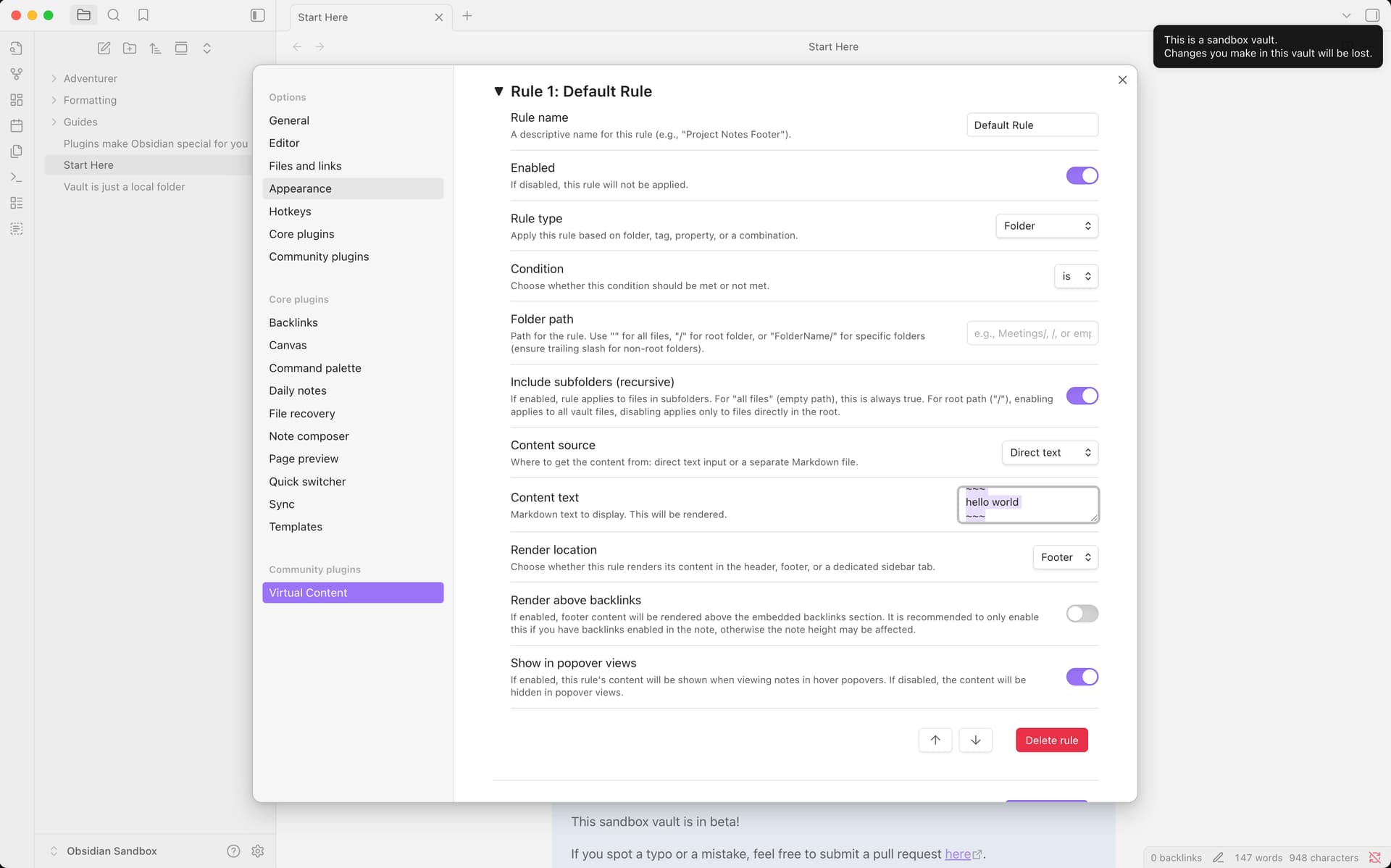 - 下载一个 virtual-content 插件,启用并打开插件设置,点击里面的 Rule 1: Default Rule 并且在 Content text 内输入