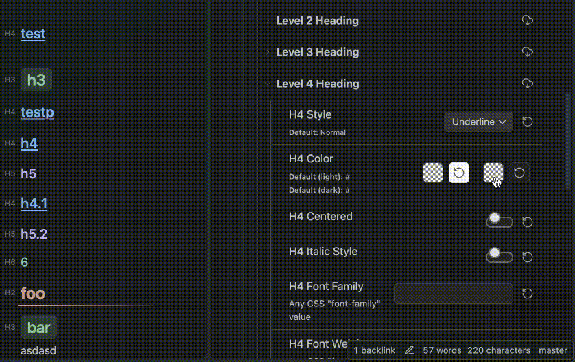 今天发现是搞错了标题颜色模式,所以修改没生效。还有一个问题,就是在链接颜色设置这里,无法调整透明度。设置完颜色后,展示出来的颜色,默认透明度会降低约80%左右,无法调整到与设置颜色一致。能增加一个设置吗