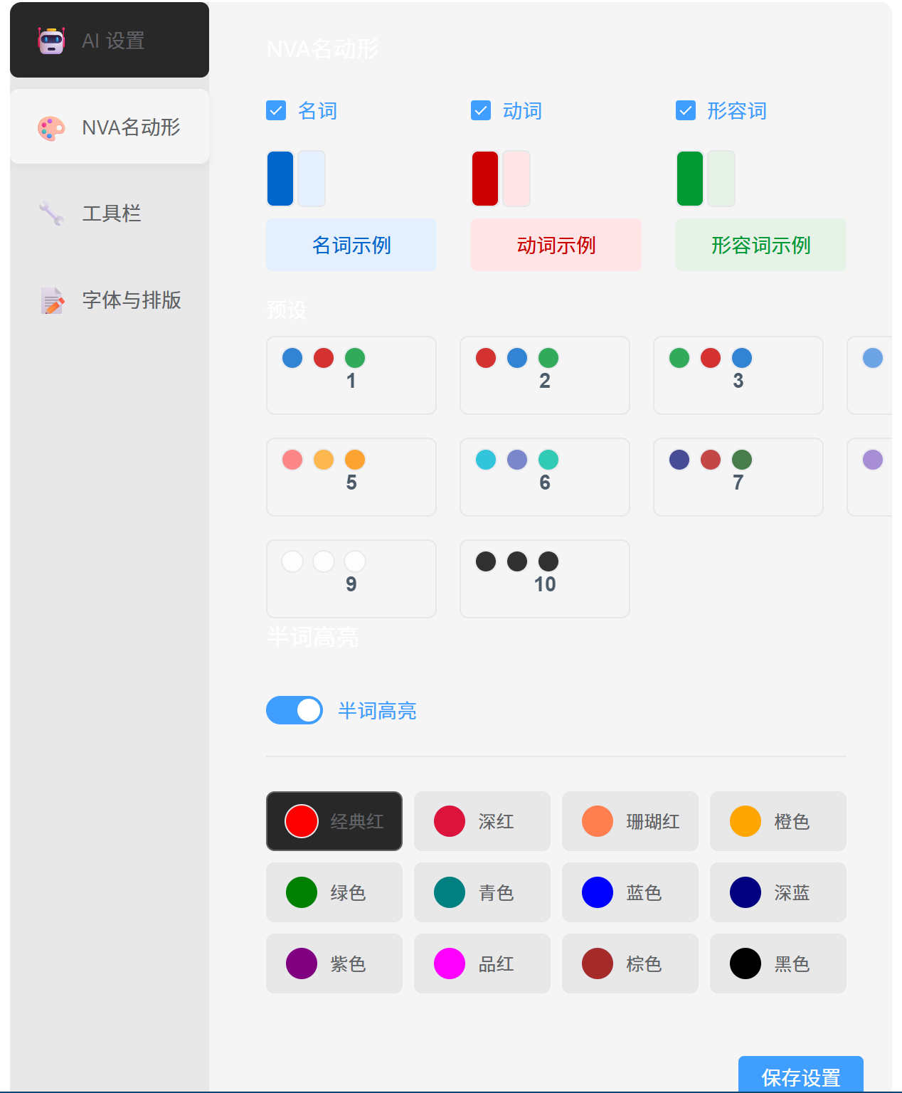 有英文版的词性高亮插件,我见过,应该是latex suite插件作者写的,但好像不适配其他语言