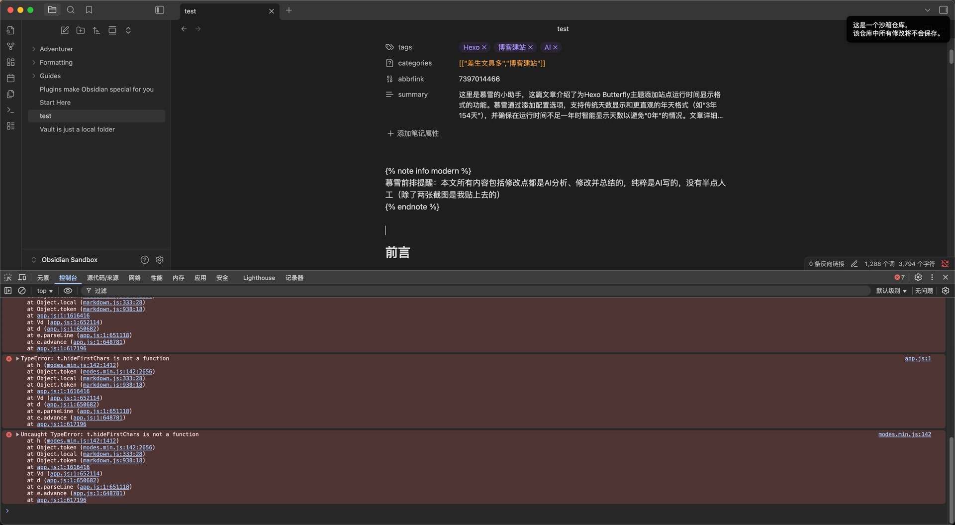 是,重新安装了obsidian,在沙箱模式下依旧出错,如图所示,完全无法编辑这篇文章