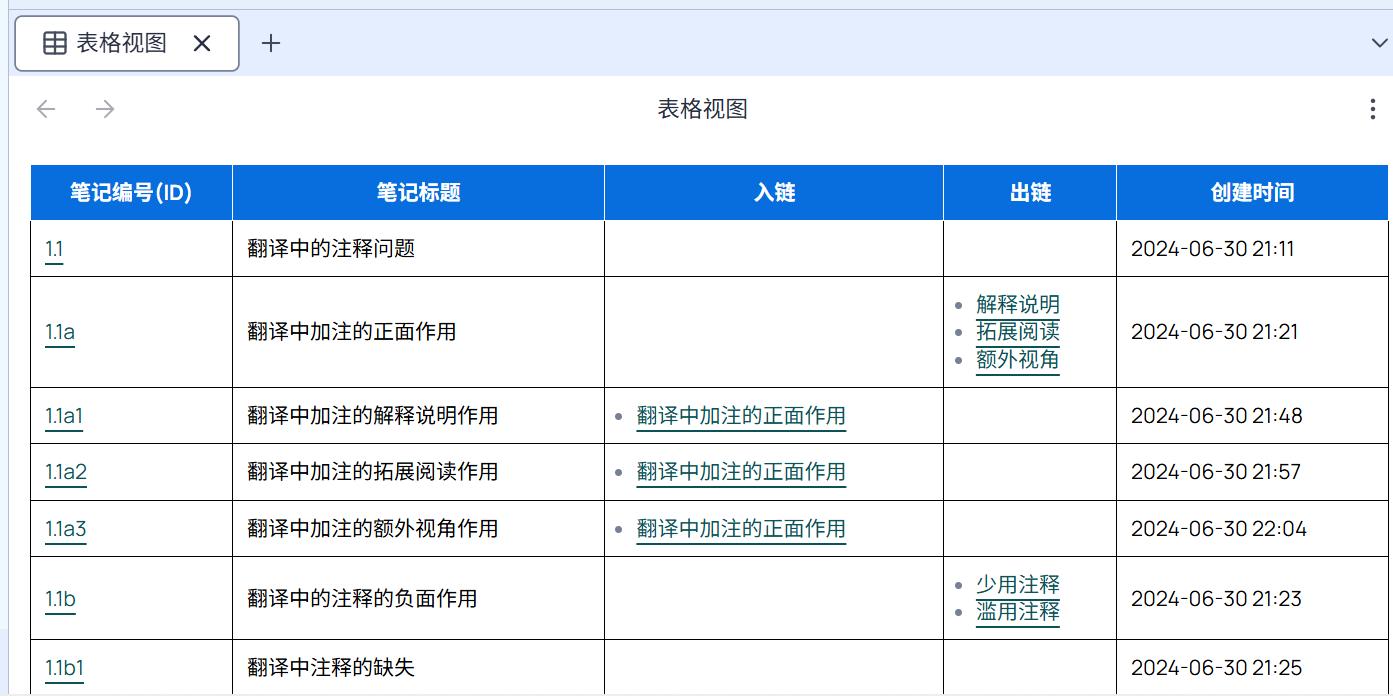 打开设置导出到白板:将当前分支视图以结构图或路线图的形式导出为白板文件随机主笔记:随机选择一篇主笔记文件夹中的笔记,展开以它为主笔记的分支视图所有树:随机选择一个关键词,展开以它为关键词的分支视图,即显示所有相同根节点的主笔记,按ID位置以树状图展示,有多少个根节点就有多少棵树表格视图:会在分支视图下方打开新标签页,将该分支内所有节点的ID、文字标题、入链、出链和创建时间以表格形式展示出来,详见下方图示大纲视图:在侧边栏将该分支内所有节点以大纲形式展示出来,详见下方图示检索记录:在分支视图进行的每一次检索(点击主笔记、关键词、随机主笔记等按钮)都会保存一条检索记录,本图标命令将在侧边栏展示检索记录,每点击一次检索记录,分支视图都会刷新