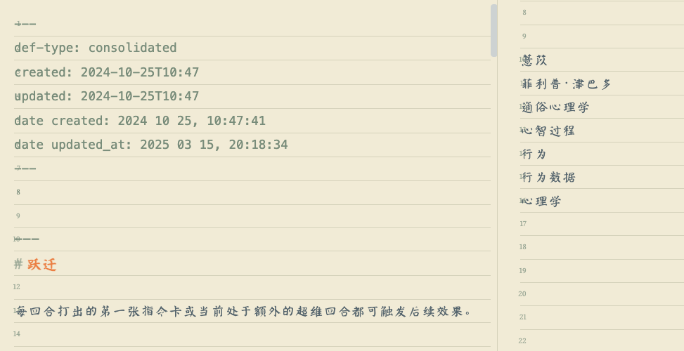 此外还有其他可能的问题我没有能完全检查出来但可能和在定义文件中使用了其他的语法有关。总之,我选择用note refactor插件吧consolidated分割为原子定义文件,然后为它们添加def-type: atomic值,解决历史遗留问题。现在用新版本的插件来生成和更新定义应该就不会造成格式不正确的问题了。