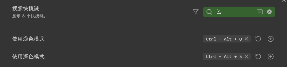 在最近一次的更新过后,我发现无法使用快捷键在浅色与深色之间切换,去检索快捷键发现已经没有这两个快捷键的选项了,以下是我回退到上一个版本之后的截图: