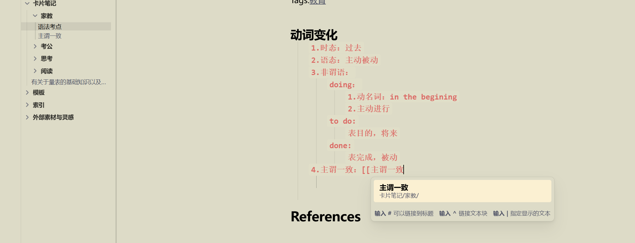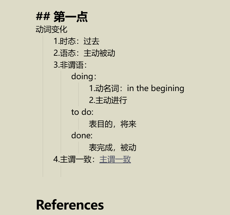 您好!感谢回复,但是我是要在保持“主谓一致”这个词条作为“动词变化”这个主题的第四个子项的前提下创造的,如果取消缩进确实可以创造链接,但是这个“主谓一致”这一点就脱离结构成为独立的条目了