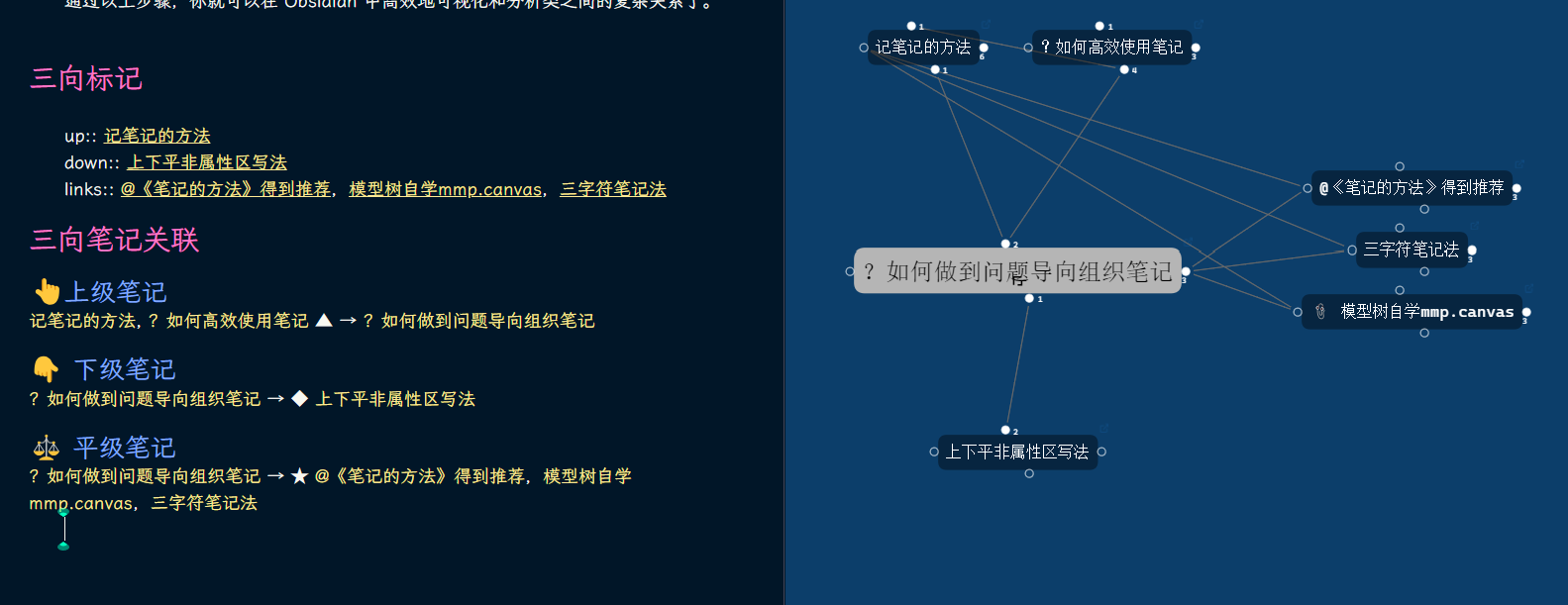 以上模板是dataviewjs代码,由两部分合并组成,一个部分显示本笔记中的标记关系,另一部分汇集其他笔记中标记的与本笔记的关系(反推汇集),最后合并在本笔记对应上、下、平关系中显示。