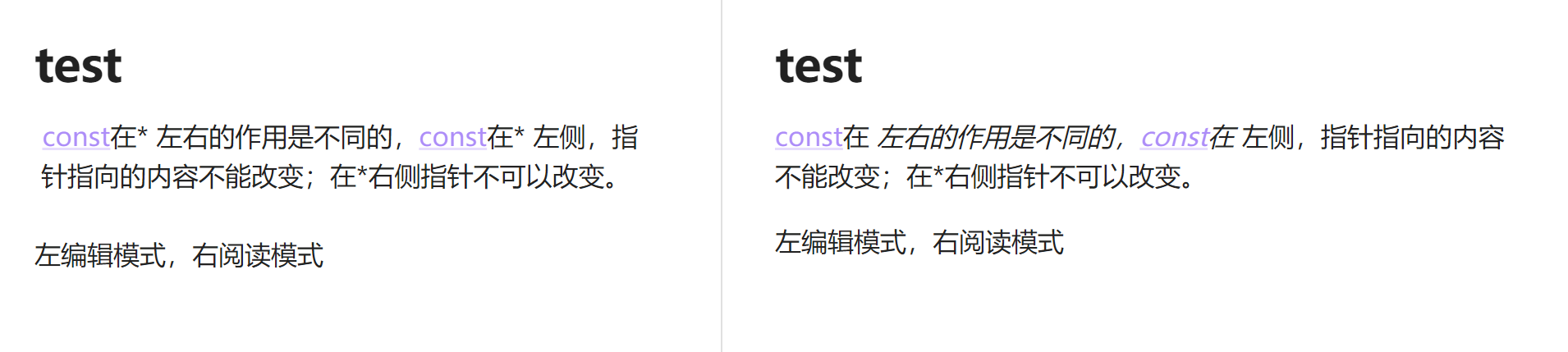 [[const]]在* 左右的作用是不同的,[[const]]在* 左侧,指针指向的内容不能改变;在\*右侧指针不可以改变。