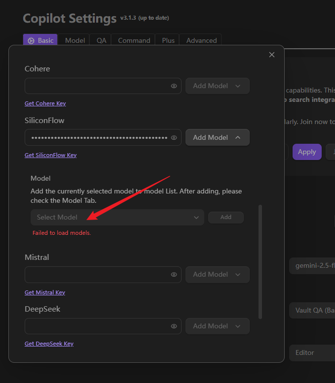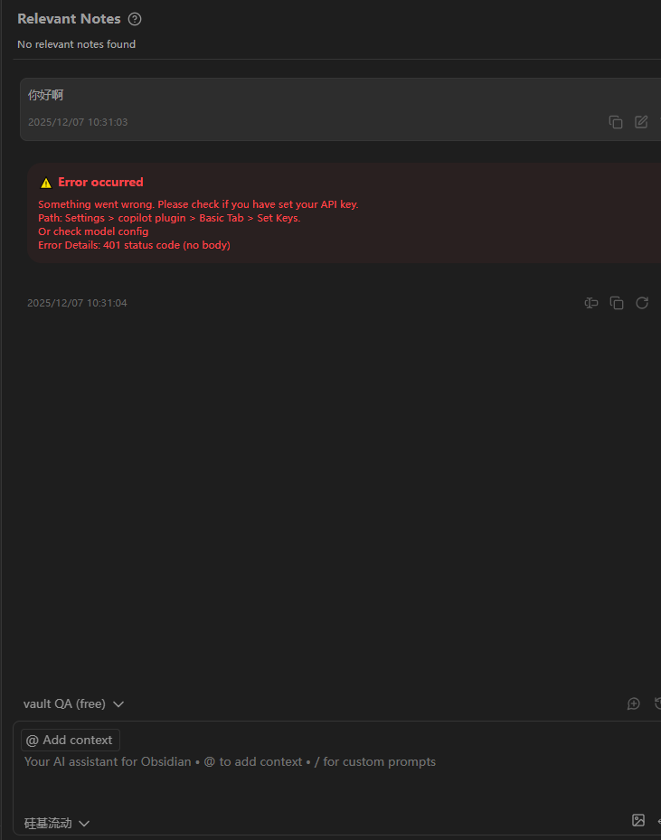 我已经在 Basic 中填入了它的 api,如下图1。 已经在 Model 里的 Chat model 和 Embedding model 中都填入了 api,如图2、图3。 为什么对话时总是说我没有设置 api 呢?如图4。