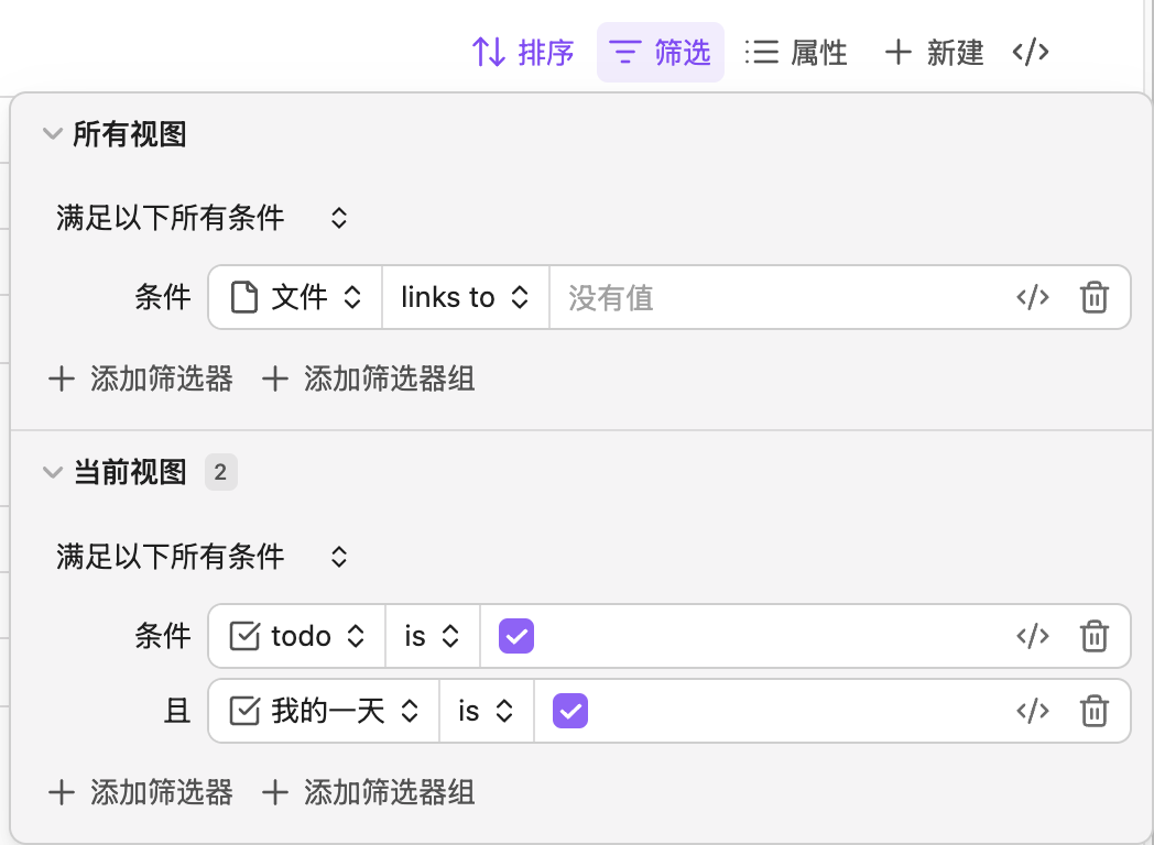 这个是比较重要的一个属性,你的数据库视图展示什么数据,全都依赖这个筛选的功能,他支持的筛选条件特别多,还支持你写函数公式。