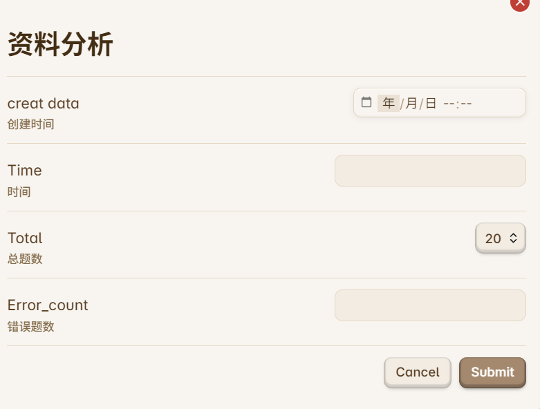 先考虑资料分析的模板需求:基础数据展示和错题收集复盘