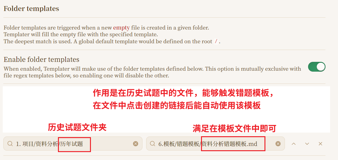 模板创建需要插件templater,首先创造两个模板文件,分别名为tp-资料分析和资料分析错题模板。配置可参考我的:tp-资料分析放在设置的模板文件夹即可,比如我的6.模板。