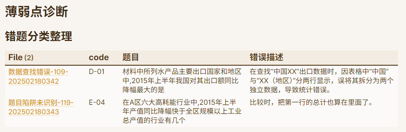 错题分析:我之前将错题集输入给AI,归纳了六种类型,并且每种类型有更细的错误分支,同时输出了编码表,方便后续其他管理。