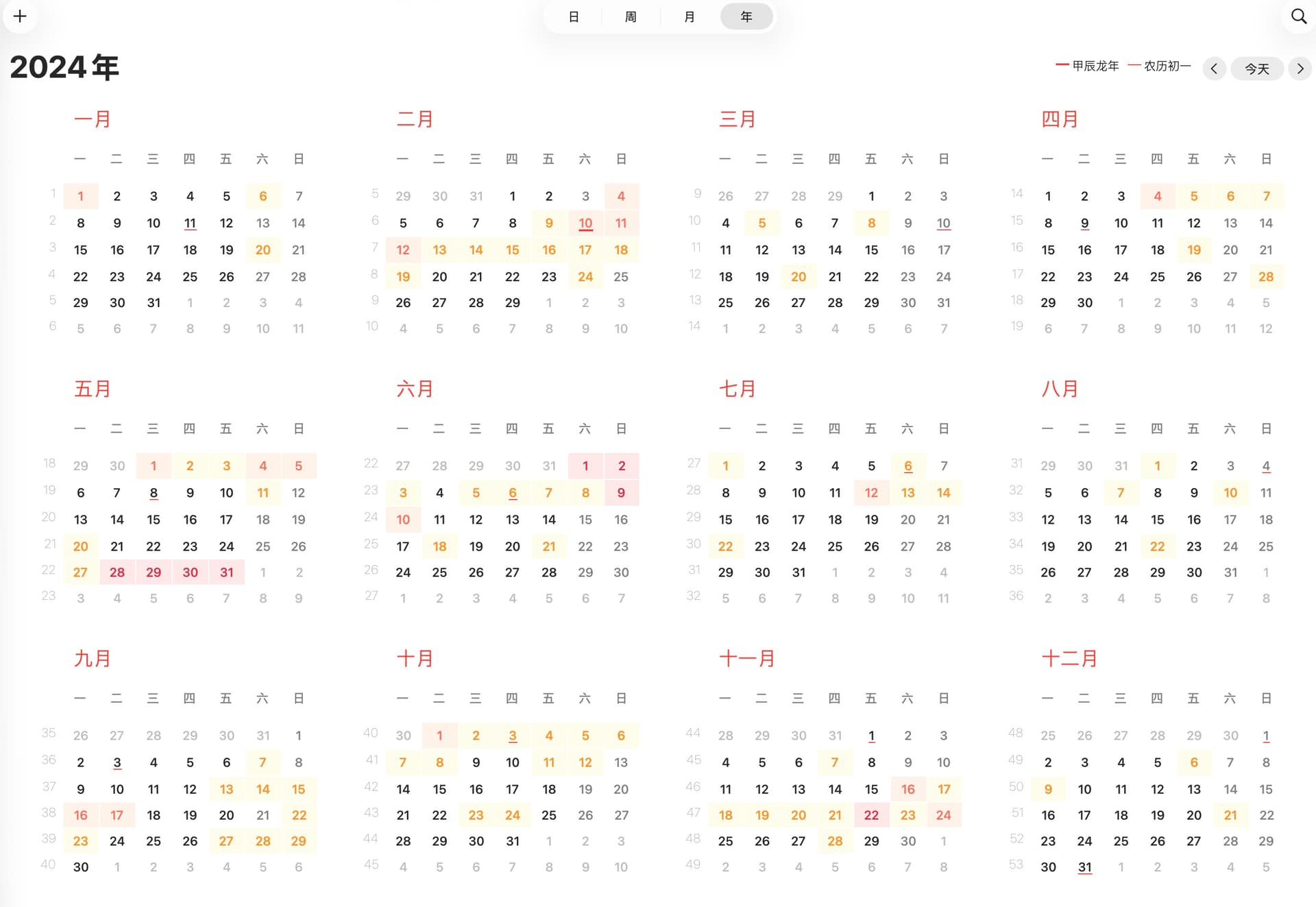 日历应该有日、周、月、年四个视图,与常规的日历插件一致,我比较喜欢macos的日历,想把苹果的日历复刻到ob中,如下图这种样式: