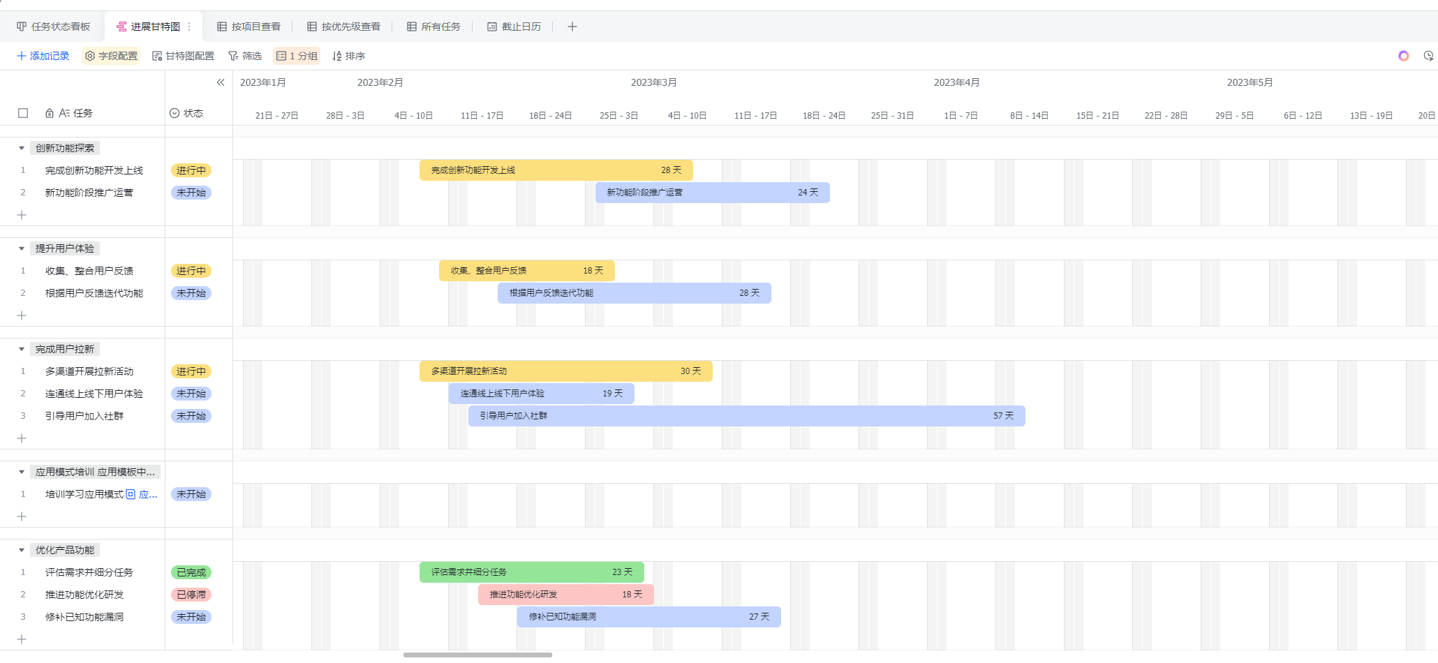 要有独立的甘特图视图,类似于notion、飞书多维表格样式的甘特图。 虽然在日历的周月年视图中也可以做甘特图,但是我还是觉得独立甘特图视角更为方便直观。