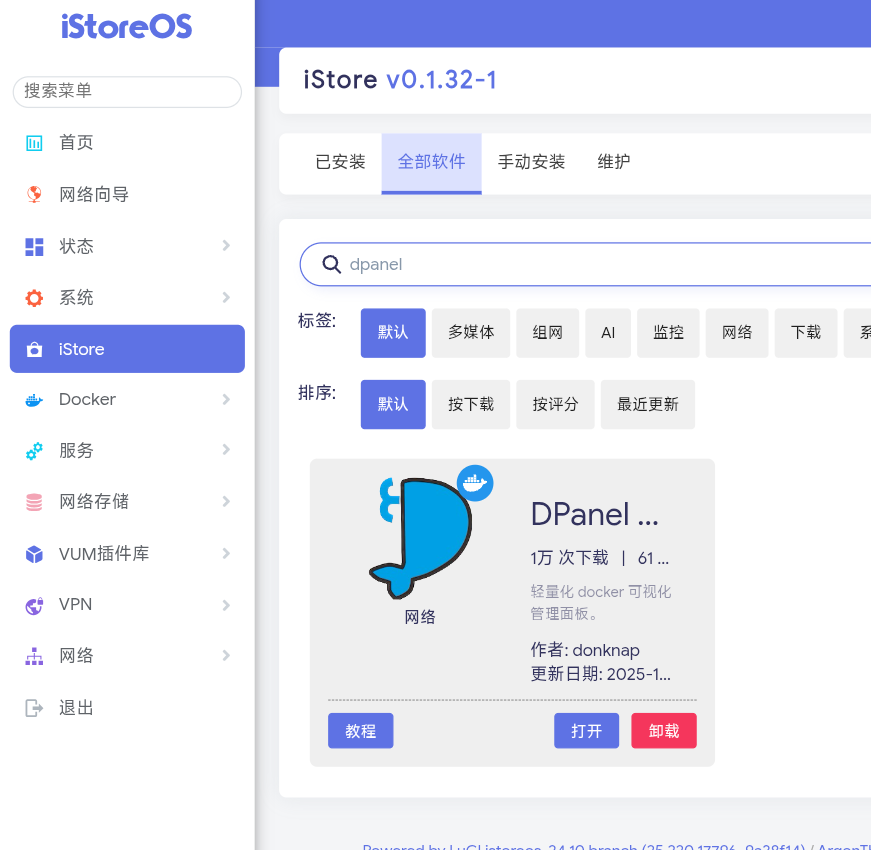 ① 打开istoreos后台,软件商店安装dpanel(点我跳转官网)做Docker部署。