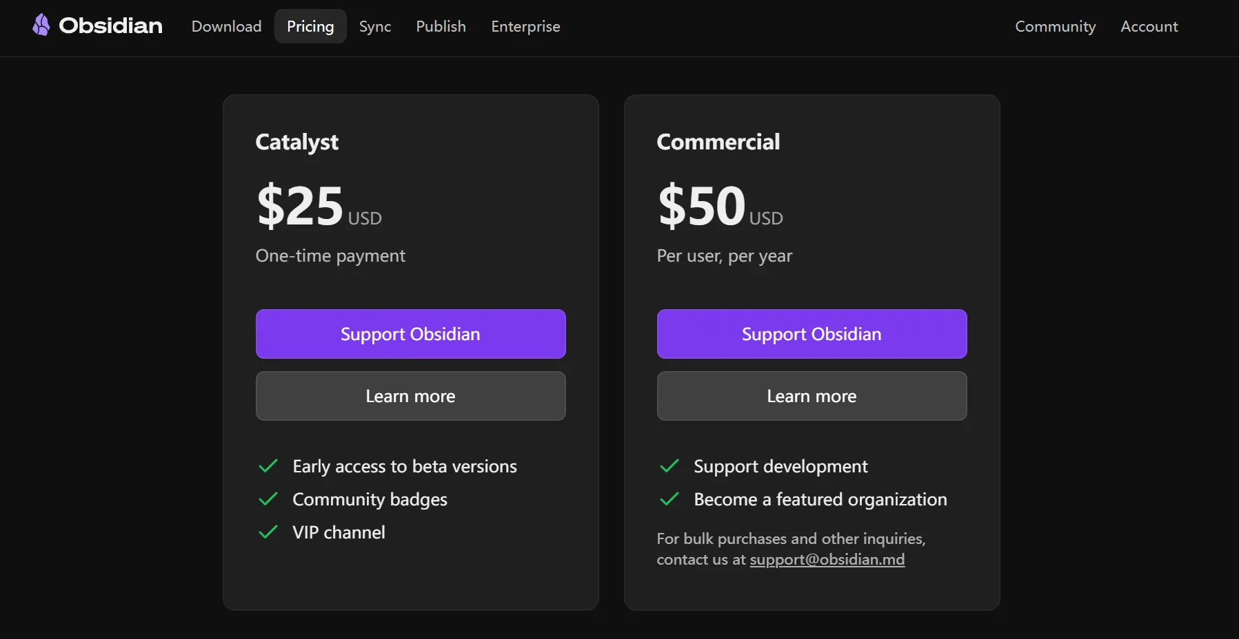 Obsidian 目前对于普通用户和商业用户都完全免费。