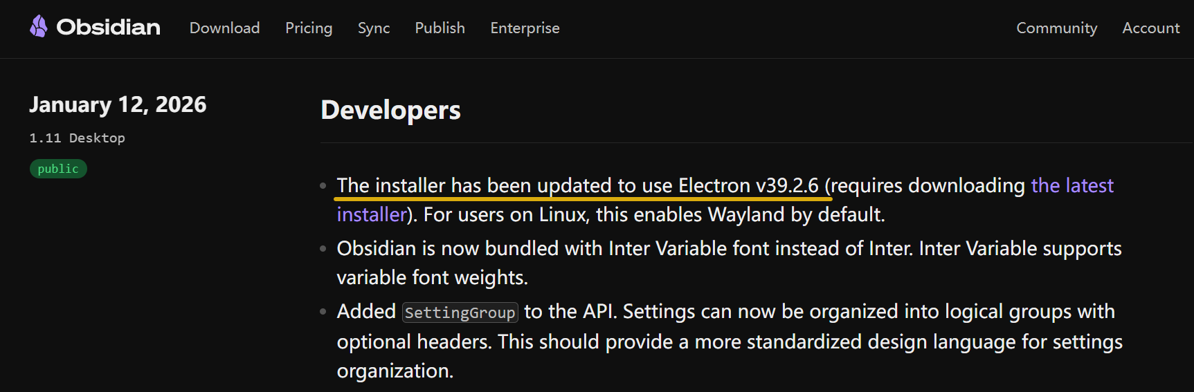 这就说明 Obsidian 1.11 的安装程序更新到了对应的 Electron 版本。