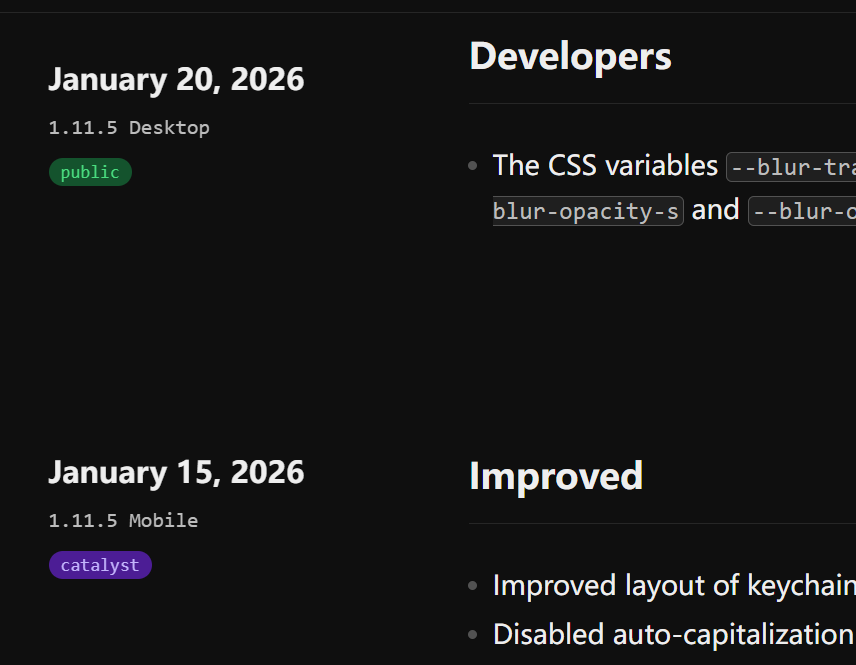 查看更新日志时你会看到 public 和 catalyst 两个标签: