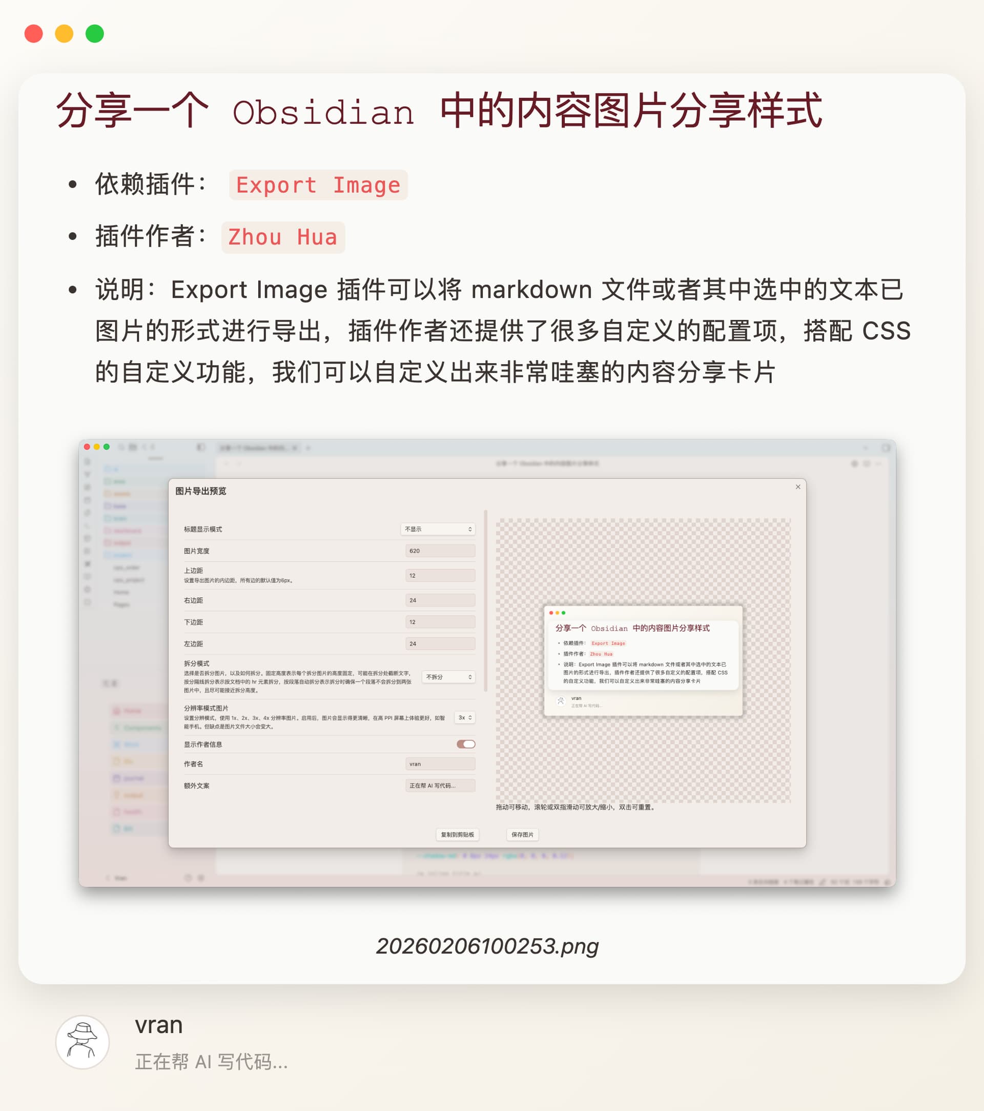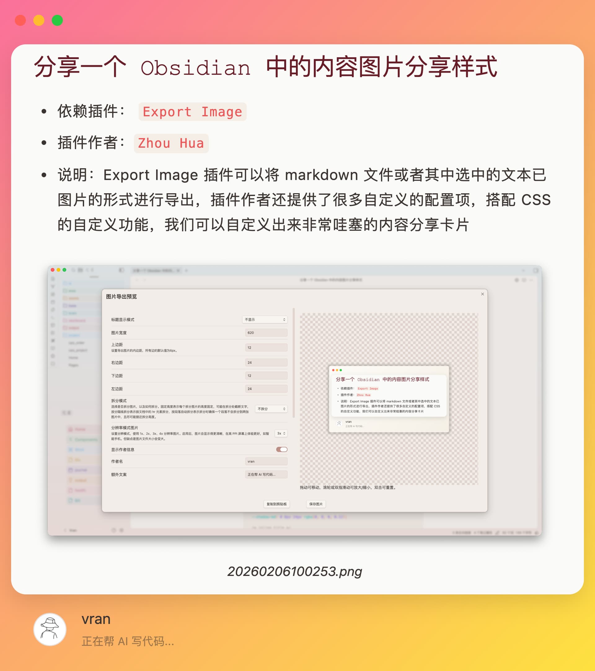 Zhou Hua - 功能说明:Export Image 插件可以将 markdown 文件或者其中选中的文本已图片的形式进行导出,插件作者还提供了很多自定义的配置项,搭配 CSS 的自定义功能,我们可以自定义出来非常哇塞的内容分享卡片