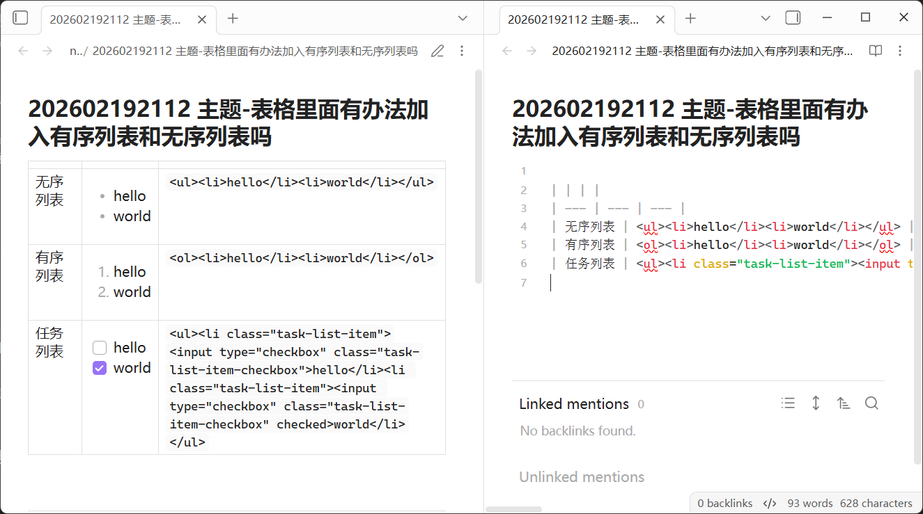 表格里面是不是不能支持加入任务列表和无序列表之类的,我尝试了一下只会显示-空格,没有办法转变成原点