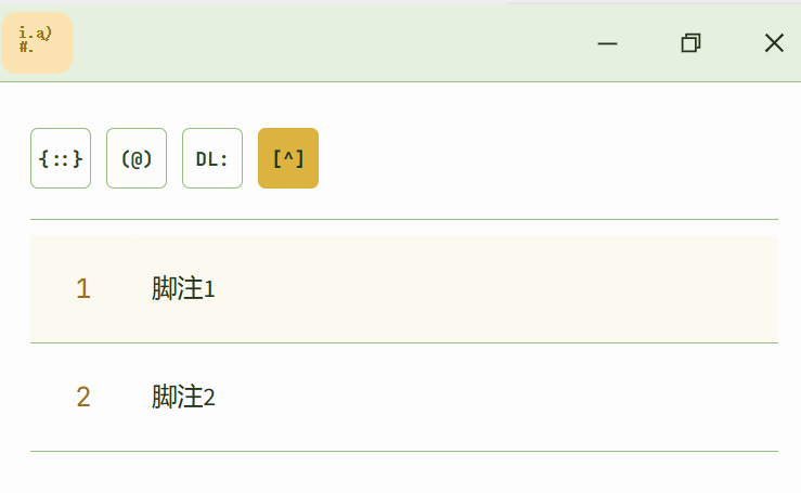 Syntax features:选择插件应该识别并渲染哪些 Pandoc 语法Hash auto-number list:如启用,则插件将识别并为由#.引出的加强列表自动编号Fancy lists:如启用,则插件将识别并渲染由A.或iv.引出的加强列表Example lists:如启用,则插件将识别并渲染示例列表Definition lists:如启用,则插件将识别并渲染定义列表Distinct unordered list markers:如启用,则插件将在实时阅览和阅读模式中识别并渲染+或*引出的无序列表Supescript:如启用,则插件将识别并渲染上标语法Subscript:如启用,则插件将识别并渲染下标语法Custom label lists:如启用,则插件将识别并渲染自定义标签列表