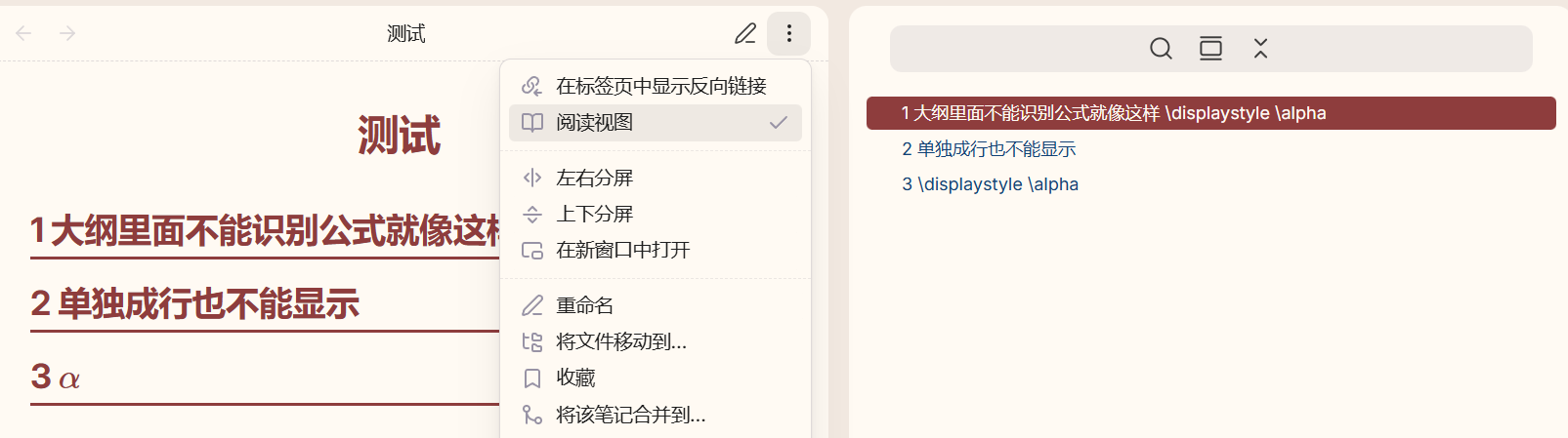 如图,看到其他人可以在大纲内渲染公式,但是我已经打开阅读模式了,大纲标题能够识别出$符号,但是显示的还是里面的latex公式代码,并不能渲染出来数学公式是为什么?